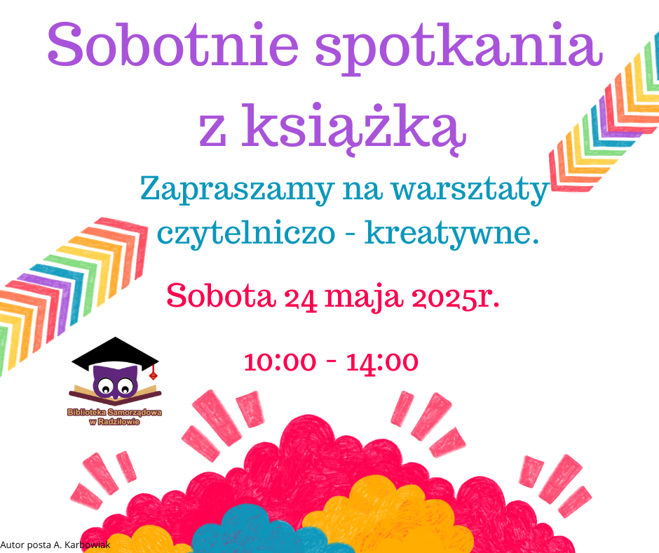 Biblioteka Sobotnie spotkania z książką 22 maja 2025 Anna Karbowiak Serdecznie zapraszamy na warsztaty czytelniczo – kreatywne do Biblioteki Samorządowej w Radziłowie. Wyświetlenia 123