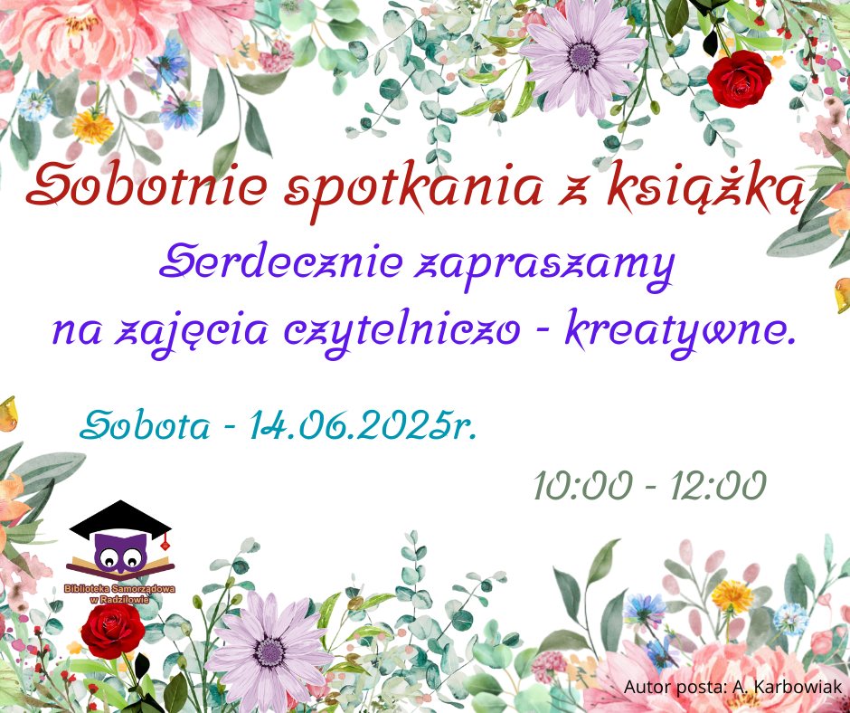 Biblioteka Sobotnie spotkania z książką – zapraszamy! 13 czerwca 2025 Anna Karbowiak Wyświetlenia 112