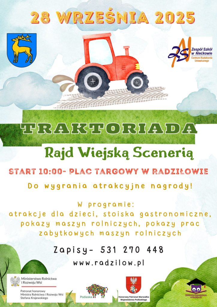 Aby wziąć udział w Traktoriadzie, należy złożyć formularz zgłoszeniowy w Bibliotece Samorządowej w Radziłowie lub w Urzędzie Gminy Radziłów do dnia 22 września 2025 r..