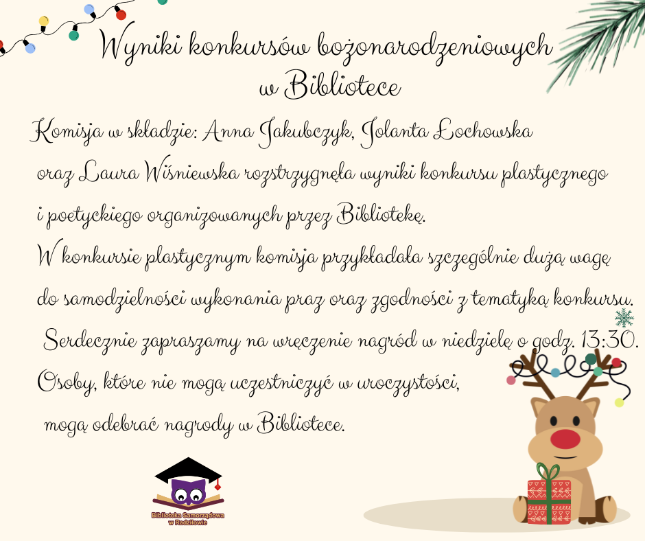 AktualnościBiblioteka Wyniki konkursów bożonarodzeniowych w Bibliotece 6 grudnia 2025 Anna Karbowiak Wyświetlenia 174