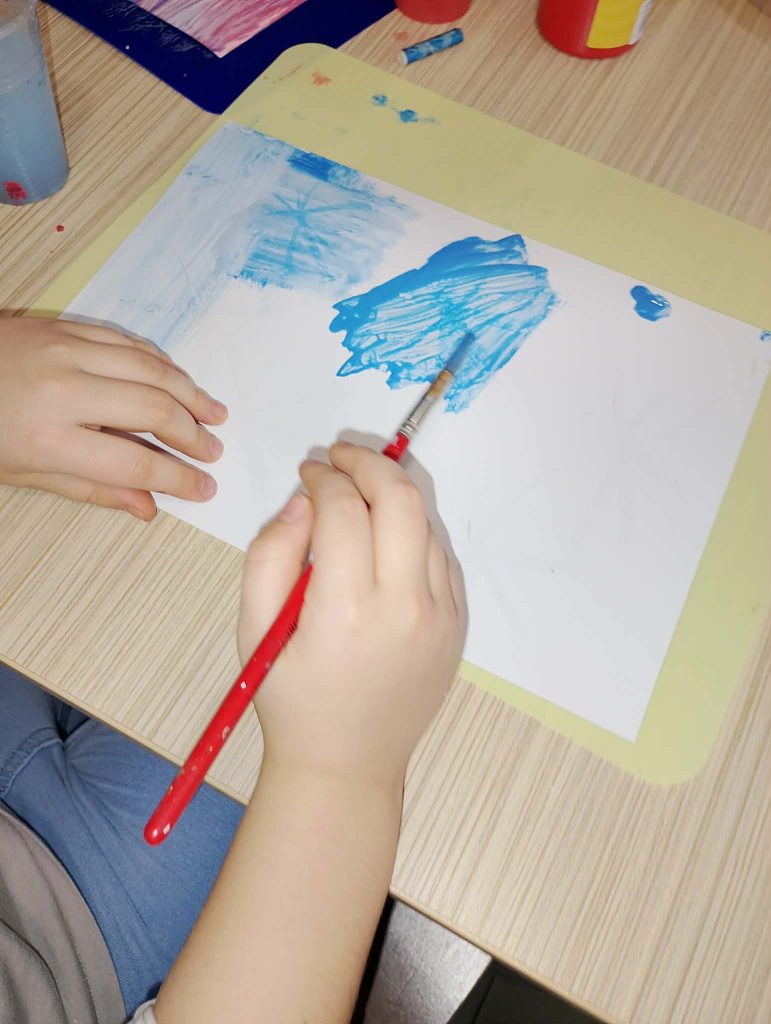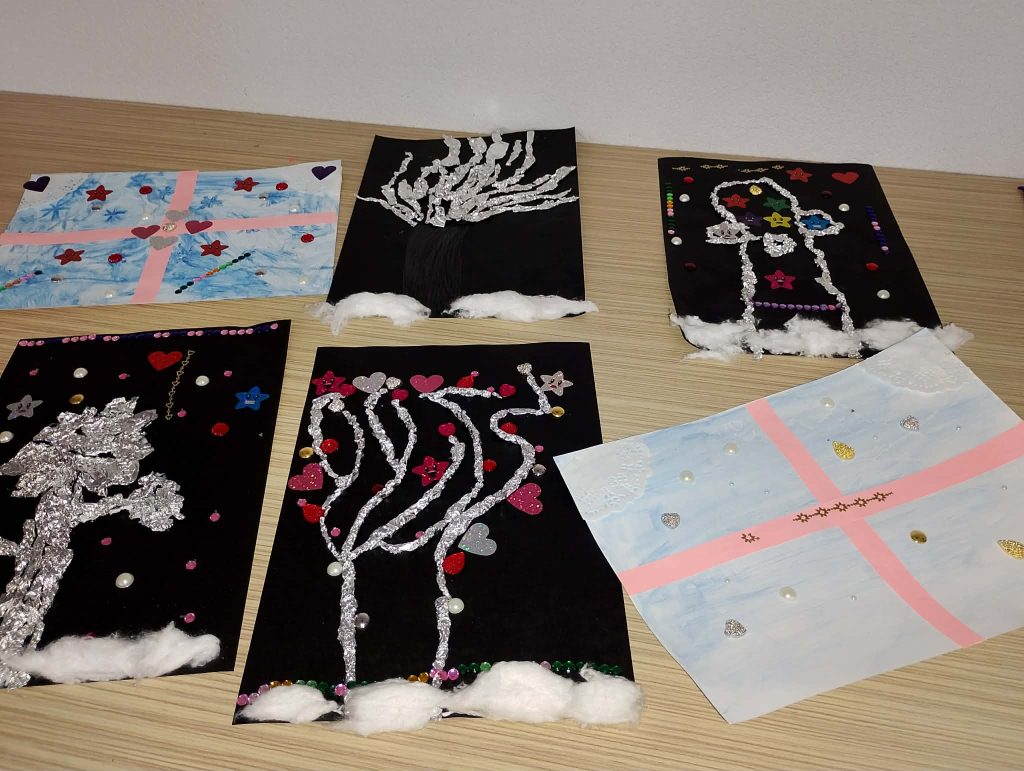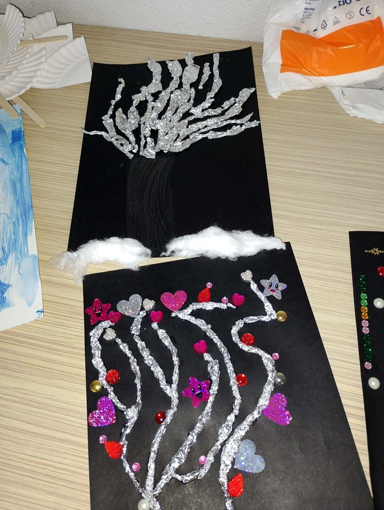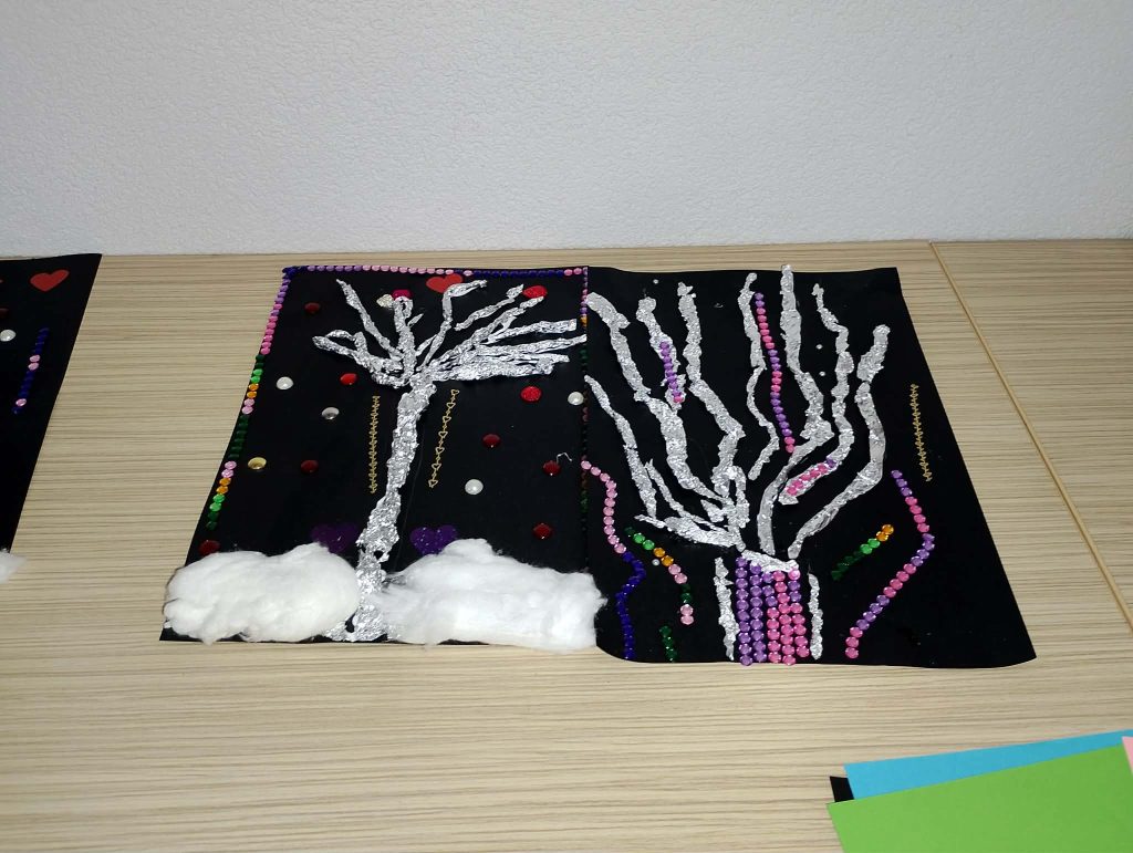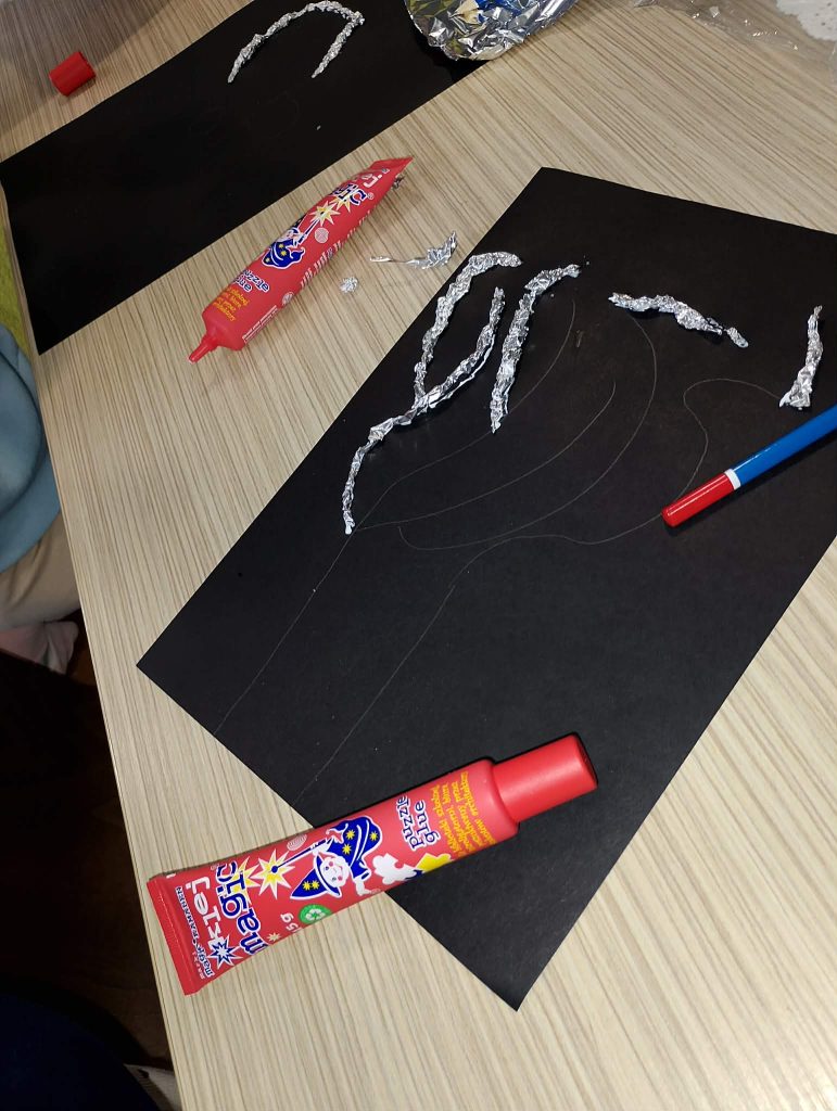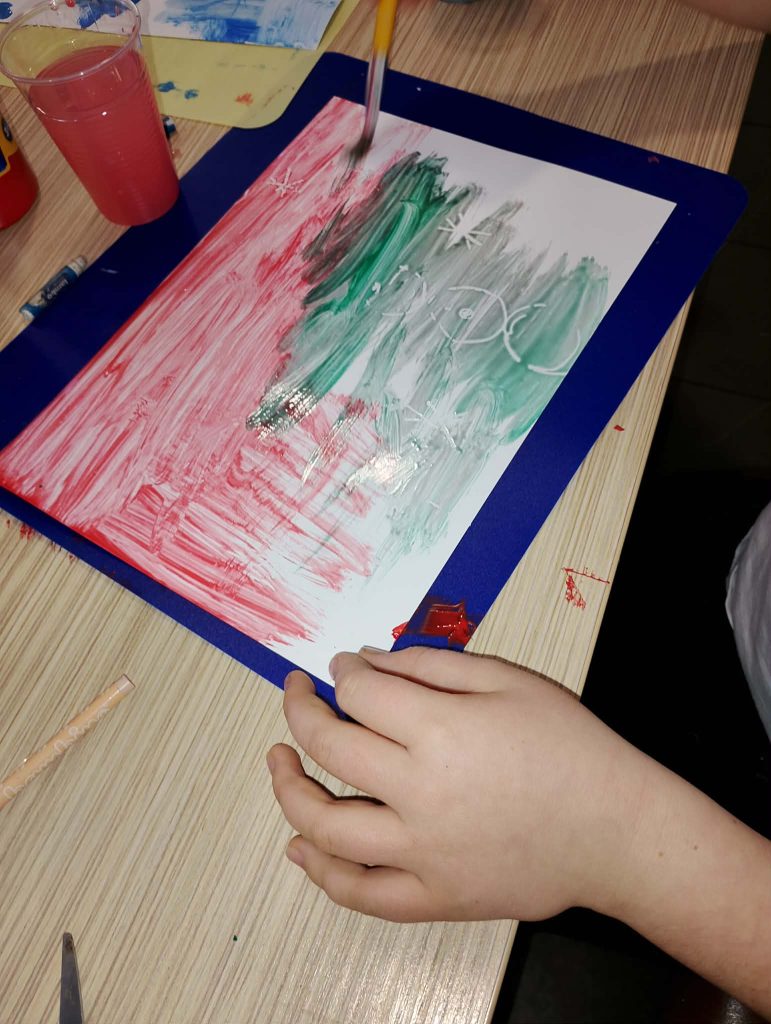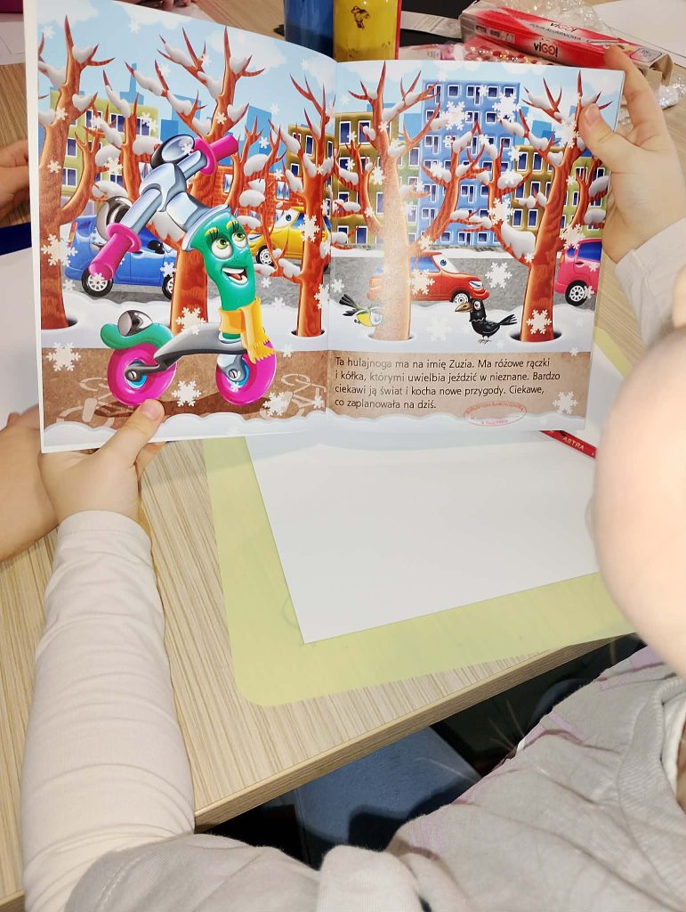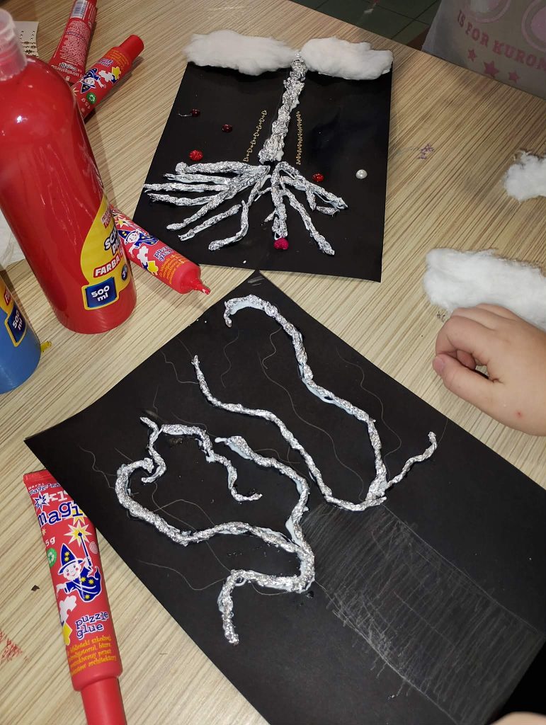 Podczas warsztatów kreatywno-literackich, w sobotę 10 stycznia, wspólnie przeczytaliśmy książkę „Zimowe zabawy”, która stała się punktem wyjścia do rozmów o zimie, wyobraźni i twórczym patrzeniu na świat. Inspiracje z lektury przenieśliśmy następnie na działania plastyczne, angażujące różne zmysły i techniki. Pierwszym zadaniem było wykonanie zimowego okna. Uczestnicy najpierw rysowali na kartkach zimowe wzory – mroźne kwiaty, śnieżynki, lodowe linie i fantazyjne ornamenty – używając białej kredki świecowe. Następnie całość została pokryta farbą, która pięknie kontrastowała z woskowym rysunkiem, odsłaniając ukryte wzory. Ta technika wywołała wiele radości i zachwytu, bo każdy obraz był inny i niepowtarzalny, niczym prawdziwe okno pokryte zimowym szronem. Kolejną pracą było zimowe drzewo z folii aluminiowej. Dzieci formowały pień i gałęzie, zgniatając i skręcając folię, ucząc się przy tym pracy z nietypowym materiałem oraz rozwijając sprawność manualną. Po uformowaniu drzewa dodawane były detale. Połyskująca folia pięknie oddawała klimat mroźnego dnia i pobudzała wyobraźnię. Powstałe prace są wyjątkowe, pełne zimowej magii i dziecięcej pomysłowości.