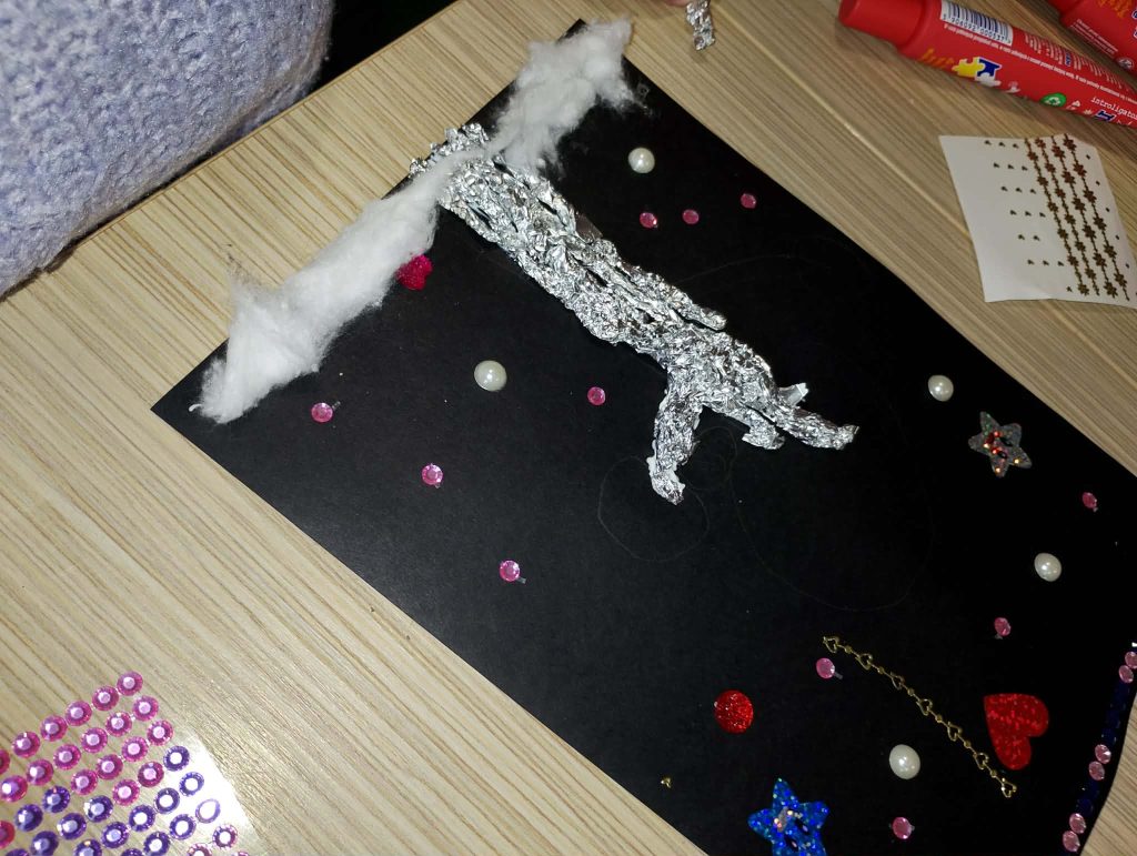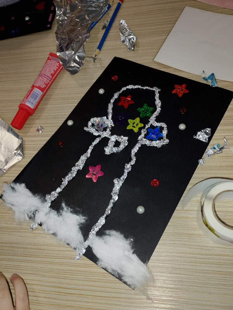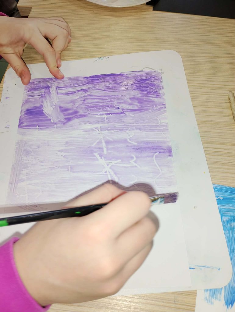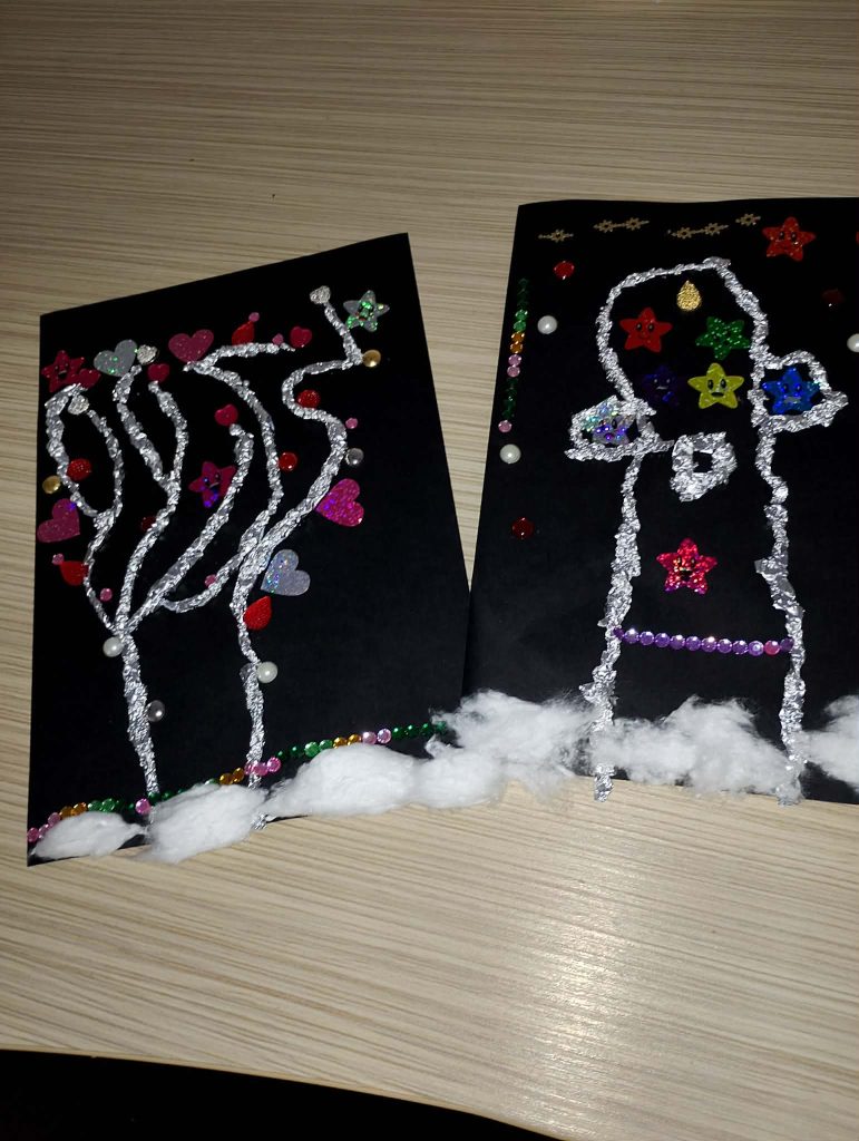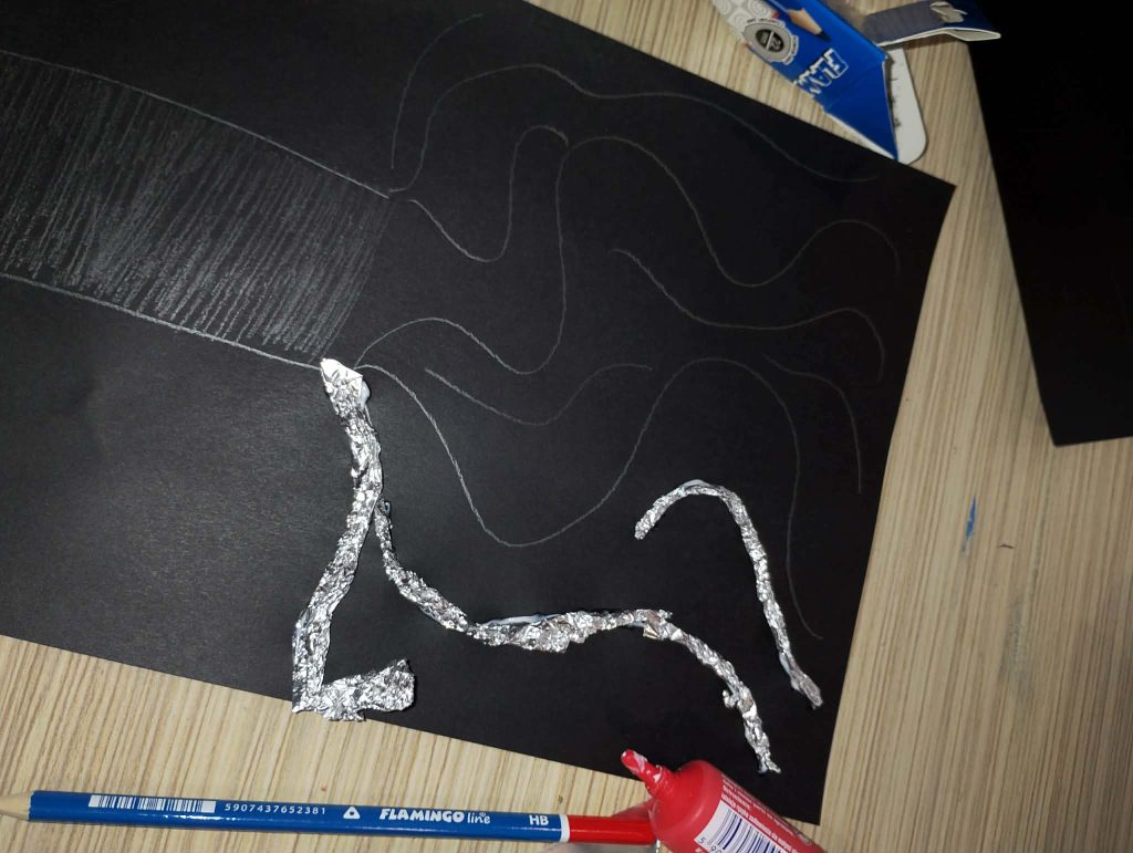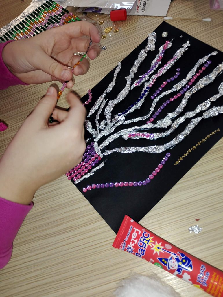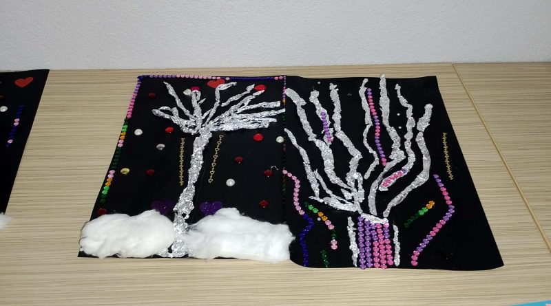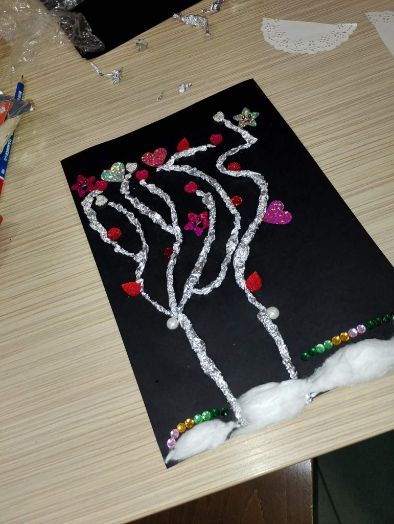 Podczas warsztatów kreatywno-literackich, w sobotę 10 stycznia, wspólnie przeczytaliśmy książkę „Zimowe zabawy”, która stała się punktem wyjścia do rozmów o zimie, wyobraźni i twórczym patrzeniu na świat. Inspiracje z lektury przenieśliśmy następnie na działania plastyczne, angażujące różne zmysły i techniki. Pierwszym zadaniem było wykonanie zimowego okna. Uczestnicy najpierw rysowali na kartkach zimowe wzory – mroźne kwiaty, śnieżynki, lodowe linie i fantazyjne ornamenty – używając białej kredki świecowe. Następnie całość została pokryta farbą, która pięknie kontrastowała z woskowym rysunkiem, odsłaniając ukryte wzory. Ta technika wywołała wiele radości i zachwytu, bo każdy obraz był inny i niepowtarzalny, niczym prawdziwe okno pokryte zimowym szronem. Kolejną pracą było zimowe drzewo z folii aluminiowej. Dzieci formowały pień i gałęzie, zgniatając i skręcając folię, ucząc się przy tym pracy z nietypowym materiałem oraz rozwijając sprawność manualną. Po uformowaniu drzewa dodawane były detale. Połyskująca folia pięknie oddawała klimat mroźnego dnia i pobudzała wyobraźnię. Powstałe prace są wyjątkowe, pełne zimowej magii i dziecięcej pomysłowości.