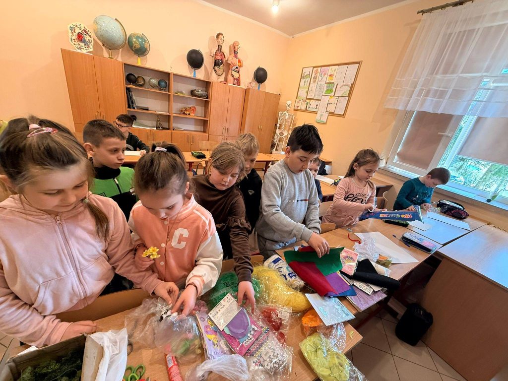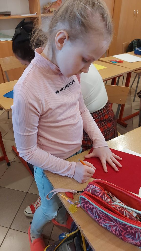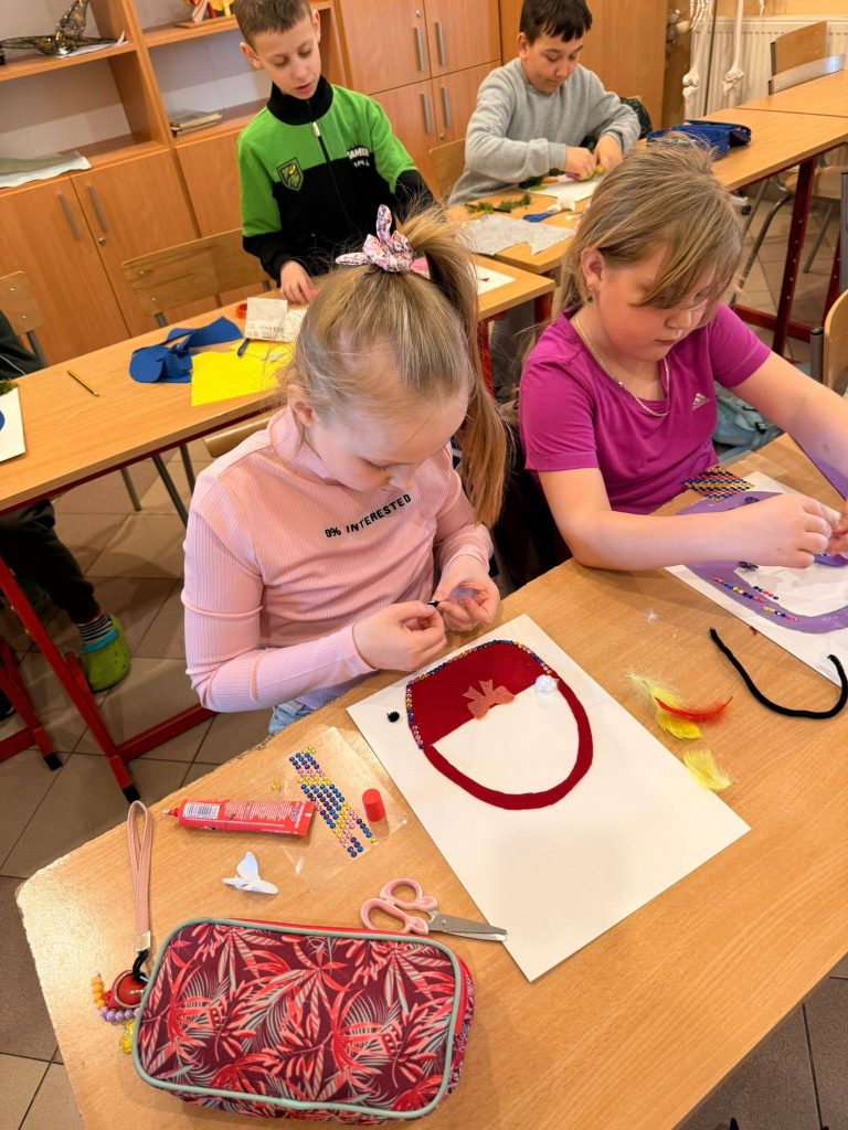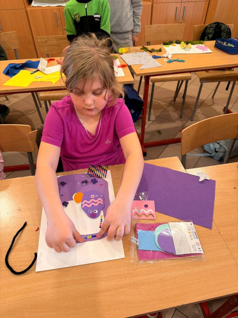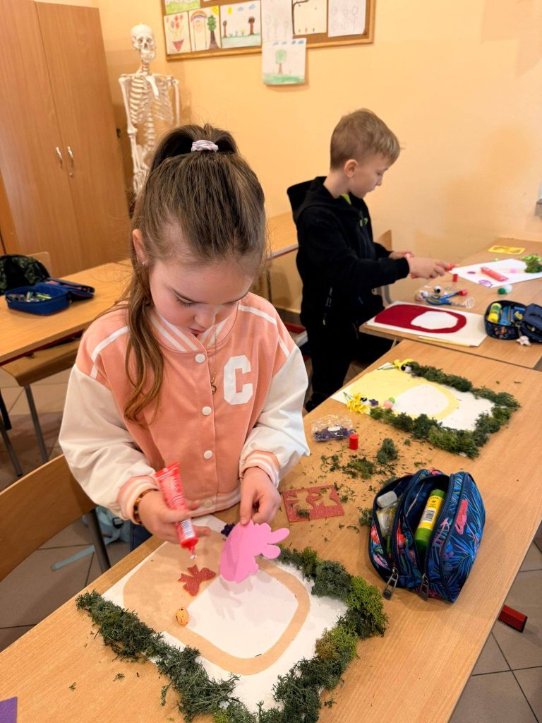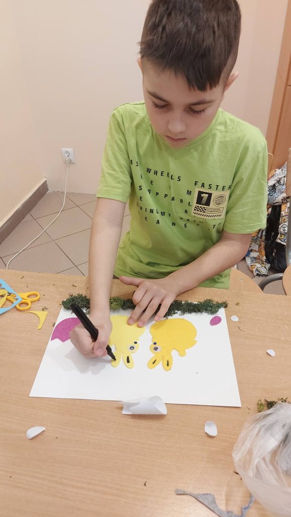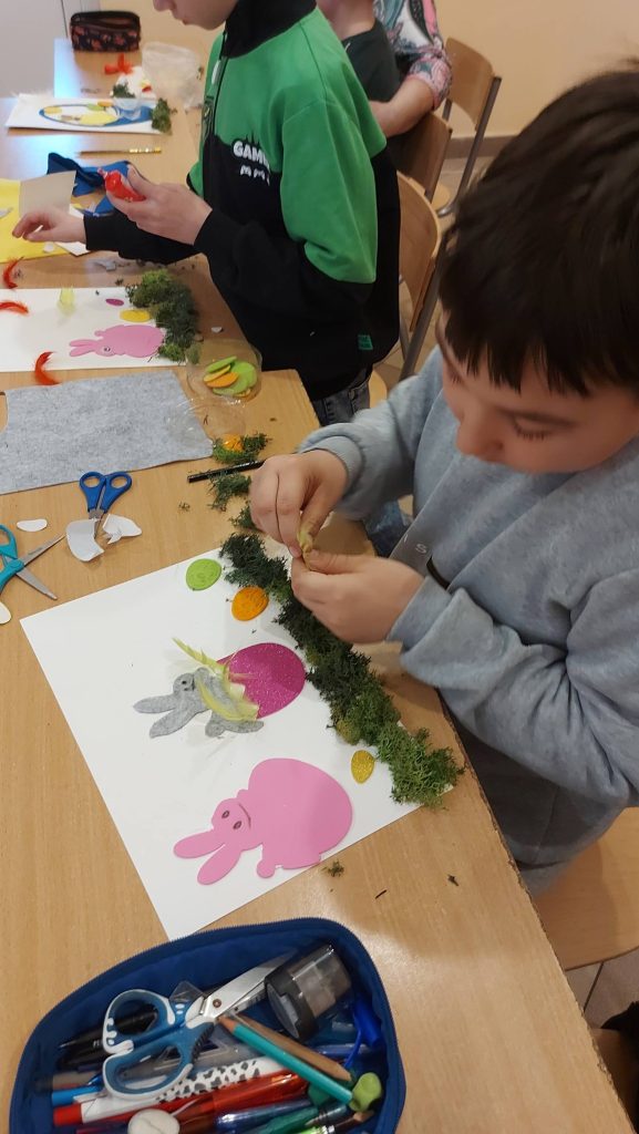 Kolejnym punktem spotkania były warsztaty. Każdy z uczniów zabrał się do pracy tworząc niesamowite ozdoby. Powstały wielkanocne koszyki wypełnione świątecznymi symbolami, o których wcześniej rozmawialiśmy, czyli kurczaczkami, zajączkami, barankami i kolorowymi pisankami.